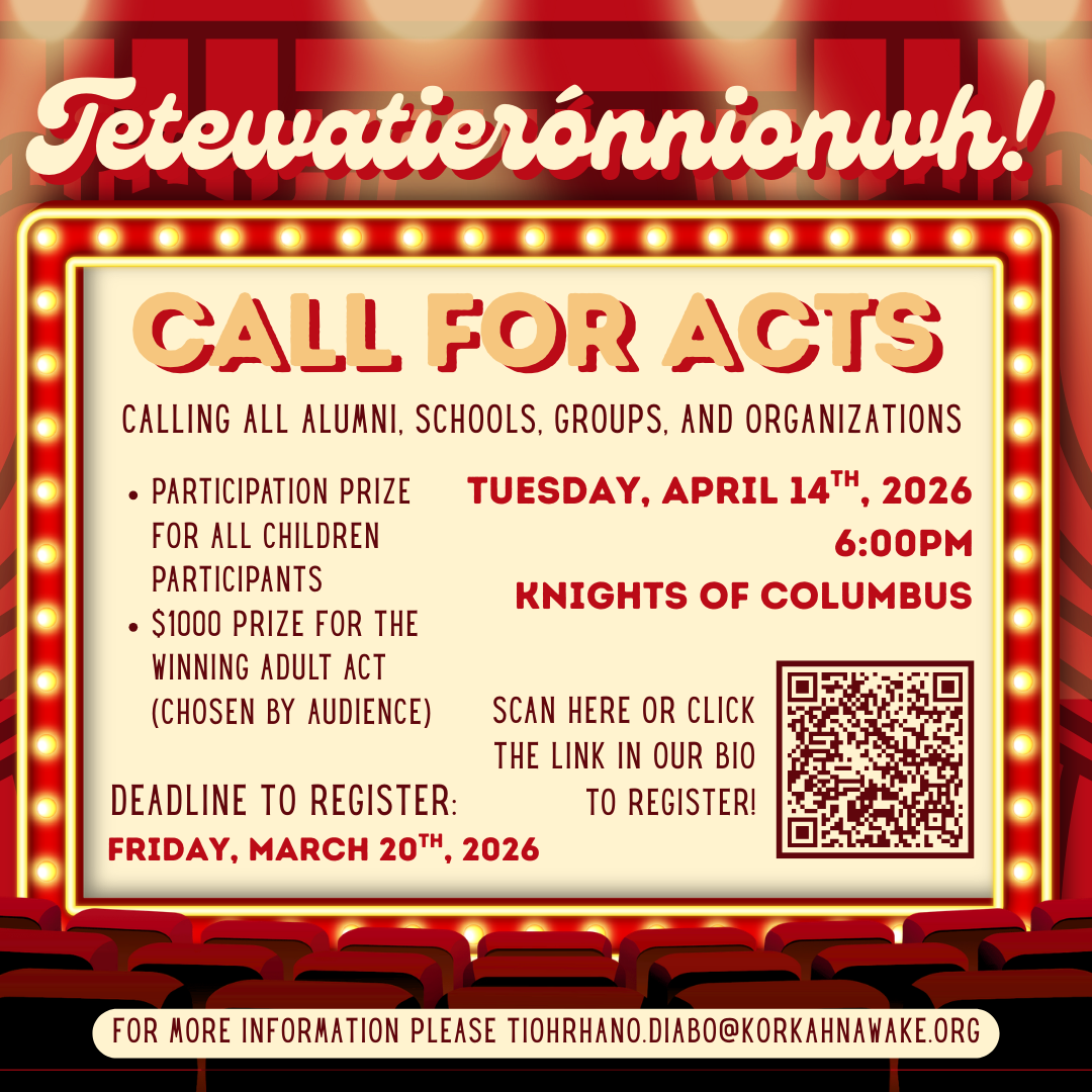 Tetewatierónnionwh Kanien’kéha Variety Show Tuesday, April 14, 2026 6:00 PM 9:00 PM Google Calendar ICS